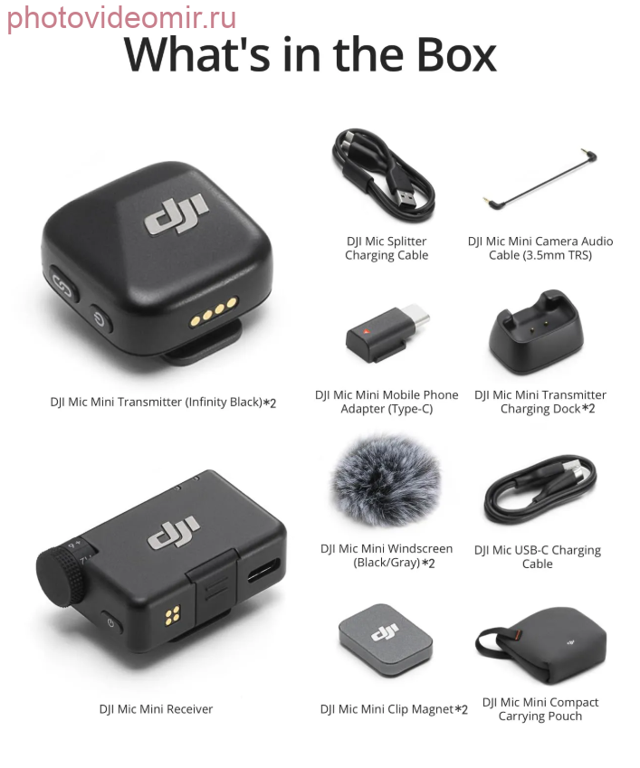 Комплектация: Микрофоны-передатчики - 2 шт. Приемник - 1 шт Кабель 3.5 мм TRS Адаптер USB-C Зарядный кабель USB-C Меховая ветрозащита, серая - 2 шт. Меховая ветрозащита, черная - 2 шт. Магниты для микрофонов - 2 шт. Зарядная станция для микрофонов - 2 шт. Чехол для хранения и переноски Гарантия – 1 год от Фотовидеомир. Характеристики Беспроводной петличный микрофон DJI Mic Mini, 2 микрофона, 1 приемник