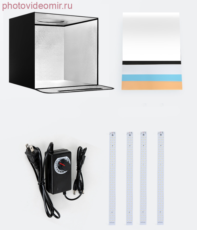 Конструкция представляет собой каркас с надетым на него тентом с внутренними серебристыми отражающими поверхностями. На верхней поверхности фотобокса предусмотрено круглое окно для съемки сверху. Крепление светодиодных линеек производится за счёт пластиковых клипс (предусмотрены в комплекте) на верхние либо на вертикальные рёбра внутрь фотобокса. Для получения более рассеянного света, в комплекте предусмотрен тканевый светорассеиватель, фиксация которого осуществляется за счёт резиновых петель к каркасу фотобокса. Для получения более качественного светотеневого рисунка — положение светорассеивателя можно регулировать по высоте. В комплекте предусмотрено 5 пластиковых полуматовых фона. Цвета фонов: чёрный, серый, белый, голубой, персиковый. Освещение Освещение фотобокса осуществляется мощными светодиодными линейками. С помощью кабеля со штекером, каждая линейка подключается к адаптеру питания. Регулировка яркости линеек и их выключение производится за счёт диммера, находящихся на корпусе адаптера питания. Суммарная мощность всех светодиодов составляет 80 Вт. Цветовая температура осветителей — 5800 К ± 200 К. Индекс цветопередачи CRI составляет более 96. Хранение и транспортировка Для хранения фотобокс собирается и может переносится в собранном виде с помощью ручек. Купить фотобокс можно порекомендовать для выездных коммерческих съёмок. Получение бестеневых фото зависит от конфигурации и размера объекта. Например, «среднестатистический» объект типа зеркального фотоаппарата с объективом, с помощью этого фотобокса, можно сфотографировать и разместить на сайте практически без постобработки. Характеристики: