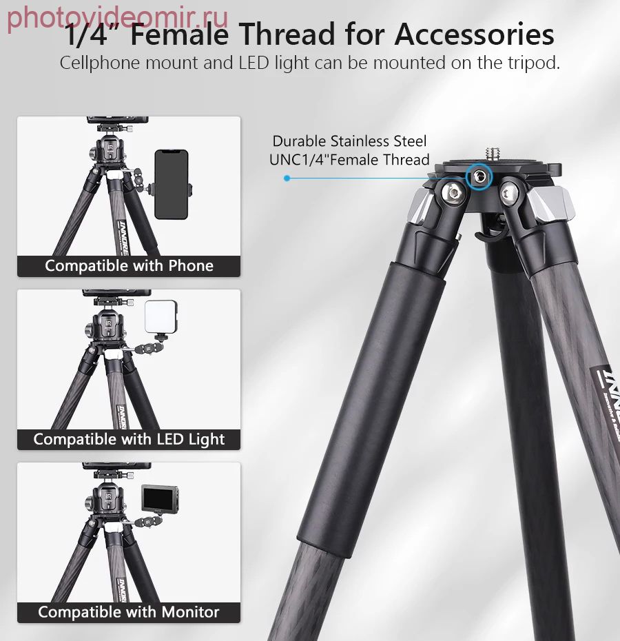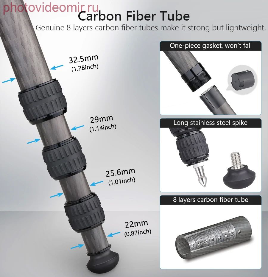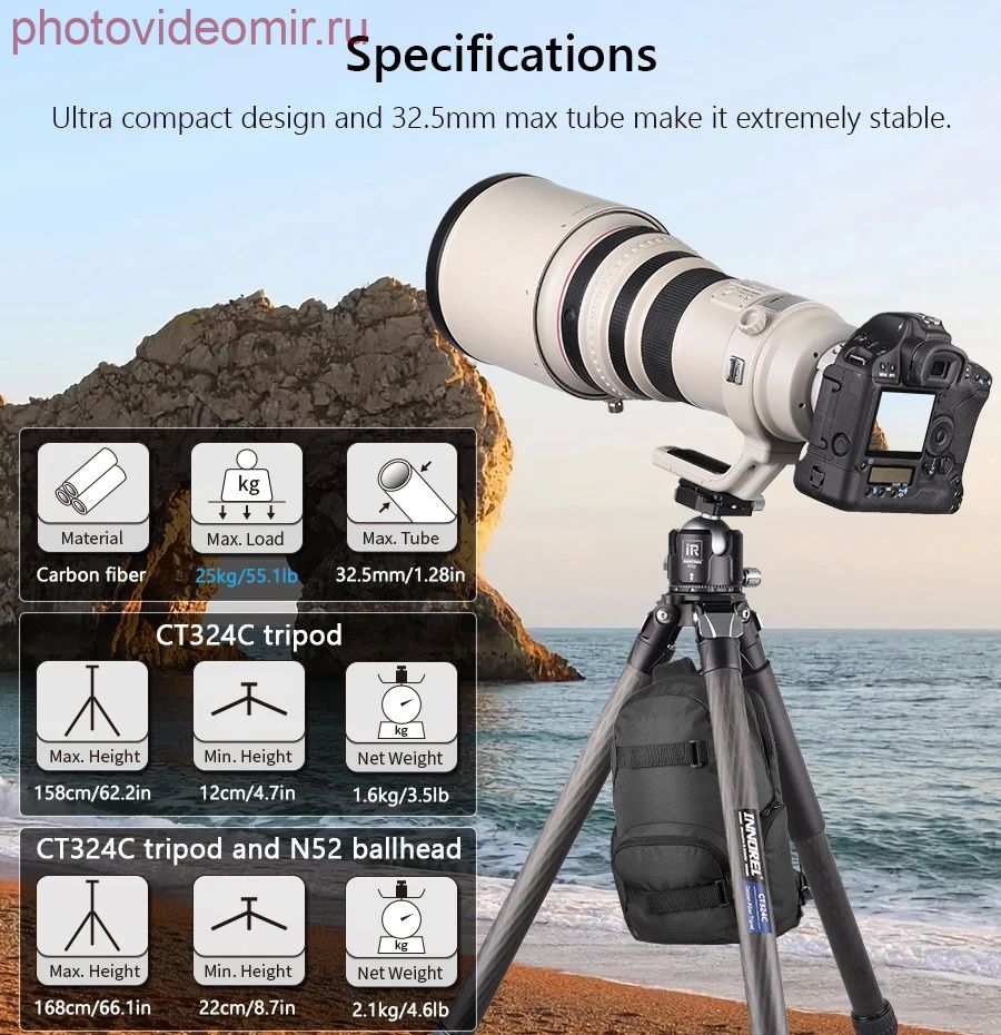 Максимальный диаметр трубки ноги 32.5 мм и минимум 22 мм, что намного больше, чем большинство штативов/моноподов. Изготовлен из углеродного волокна, чтобы максимизировать прочность ног относительно веса. Максимальная нагрузка до 25 кг. Компактный и прочный Предназначен для обеспечения компактной и легкой поддержки камеры. Длина в сложенном виде составляет 58 см и вес нетто составляет 1,6 кг. Диаметр в сложенном состоянии – 8,4 см. В 4-х секционные ноги имеют поворотные замки и могут быть отрегулированы самостоятельно, удлиняя высоту с 12 см до 158 см. Профессиональная технология Все основные части (кроме трубок) CT324C изготовлены по ЧПУ технологии с покрытием методом анодного окисления, что делает поверхность намного лучше и более гладкой, цвет штатива более хорошо распределен. Многоугольная съемка Вы можете получить более подходящую высоту, поставив пружинную пряжку, оснащенную взаимозаменяемыми резиновыми шипами и шипами из нержавеющей стали, чтобы вы могли использовать штатив в различных ситуациях, особенно на неровной поверхности. Характеристики: Бренд: INNOREL Модель: CT324C Материал: углеродное волокно (трубки) Алюминиевый сплав (корпус) Максимальная нагрузка: 25 кг Вес нетто: 1,6 кг Максимальная высота: 158 см Длина в сложенном виде: 58 см Секции: 4 Диаметр трубки: 32.5/29/25.6/22 мм Комплектация: - CT324C Штатив * 1 - Шестигранный ключ * 3 - Спайк из нержавеющей стали * 3 - Сумка для штатива * 1 - Коробка штатива * 1 - Ремень для штатива * 1 Характеристики Штатив карбоновый Innorel INNOREL CT324C