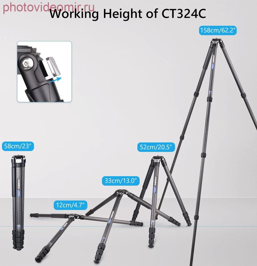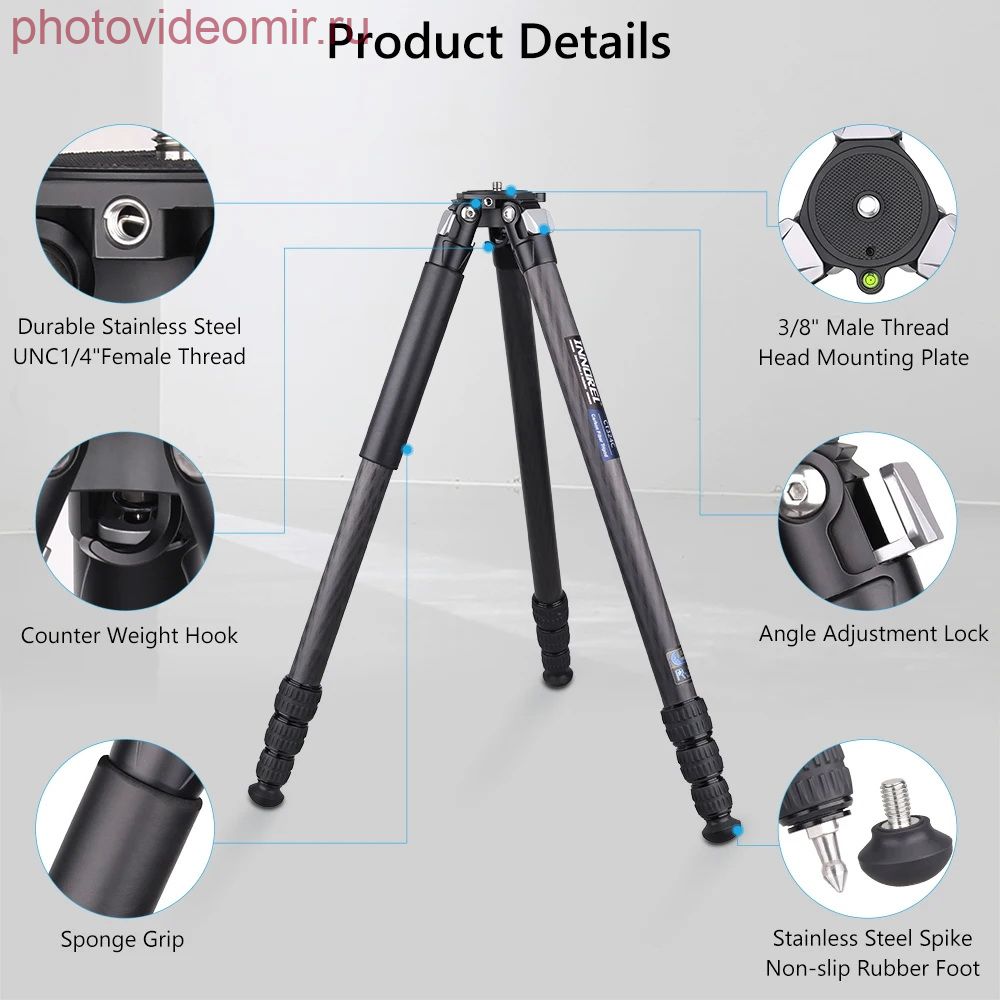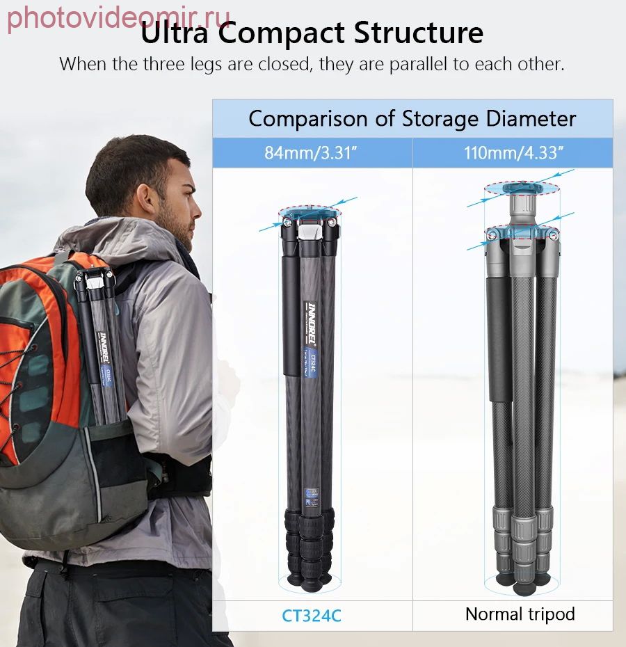 Максимальный диаметр трубки ноги 32.5 мм и минимум 22 мм, что намного больше, чем большинство штативов/моноподов. Изготовлен из углеродного волокна, чтобы максимизировать прочность ног относительно веса. Максимальная нагрузка до 25 кг. Компактный и прочный Предназначен для обеспечения компактной и легкой поддержки камеры. Длина в сложенном виде составляет 58 см и вес нетто составляет 1,6 кг. Диаметр в сложенном состоянии – 8,4 см. В 4-х секционные ноги имеют поворотные замки и могут быть отрегулированы самостоятельно, удлиняя высоту с 12 см до 158 см. Профессиональная технология Все основные части (кроме трубок) CT324C изготовлены по ЧПУ технологии с покрытием методом анодного окисления, что делает поверхность намного лучше и более гладкой, цвет штатива более хорошо распределен. Многоугольная съемка Вы можете получить более подходящую высоту, поставив пружинную пряжку, оснащенную взаимозаменяемыми резиновыми шипами и шипами из нержавеющей стали, чтобы вы могли использовать штатив в различных ситуациях, особенно на неровной поверхности. Характеристики: Бренд: INNOREL Модель: CT324C Материал: углеродное волокно (трубки) Алюминиевый сплав (корпус) Максимальная нагрузка: 25 кг Вес нетто: 1,6 кг Максимальная высота: 158 см Длина в сложенном виде: 58 см Секции: 4 Диаметр трубки: 32.5/29/25.6/22 мм Комплектация: - CT324C Штатив * 1 - Шестигранный ключ * 3 - Спайк из нержавеющей стали * 3 - Сумка для штатива * 1 - Коробка штатива * 1 - Ремень для штатива * 1 Характеристики Штатив карбоновый Innorel INNOREL CT324C