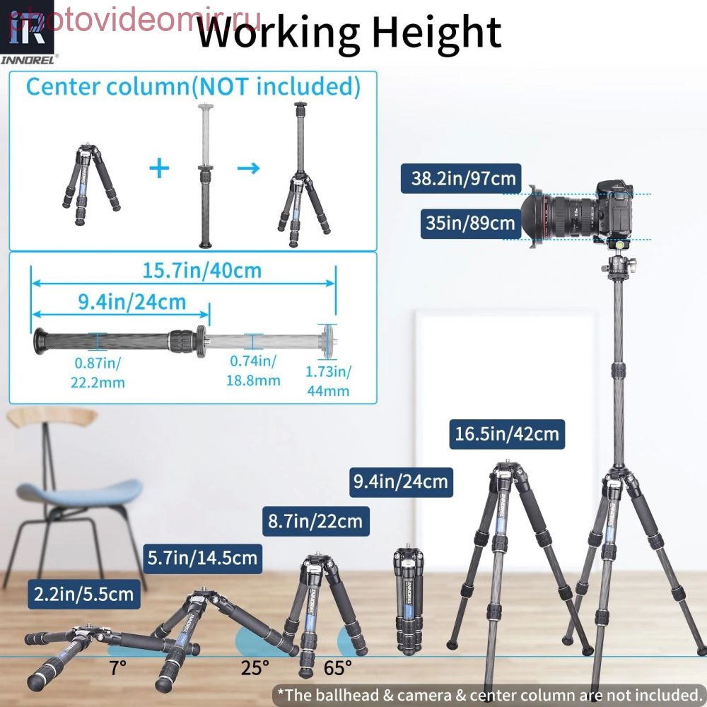 Компактный и портативный Длина в сложенном виде CT223C составляет всего 24 см, а вес нетто CT223C составляет 0,57 кг. Маленький штатив очень компактный и портативный. Вы даже можете держать его в кармане, чтобы удовлетворить ваши потребности в съемке в любое время и в любом месте, отличный выбор для путешествий. Регулировка на 3 угла Штатив можно удобно отрегулировать на три угла (7 °/25 °/65 °). С 3-секционными трубками и 2-секционной центральной колонной рабочая высота может варьироваться от 12 см до 42см, что позволяет легко достичь низкого положения, например, для макросъемки или других требований к съемке. Отличные детализации Настольный штатив адаптирует цельную прокладку в трубках для защиты от падения, специально подобранная резиновая прокладка с тремя углами открывания стопы может сделать штатив более устойчивым. В основном корпусе есть два отверстия для расширительных винтов ¼”, вы можете добавить насадки, такие как Magic Arm и зажим для телефона - для съемки с нескольких устройств. Дополнительный мини наборы штативов Мини наборы штативов включает двухсекционную центральную стойку, вы можете использовать ее для достижения большей рабочей высоты. Есть также Magic Arm и набор зажимов для телефона, вы можете использовать их, чтобы установить на штатив смартфон для съемки. Также предоставляется дополнительная быстросъемная пластина, чтобы можно быстро менять разные камеры. Характеристики: Бренд: INNOREL Модель: CT223C Материал: углеродное волокно (трубки) Алюминиевый сплав (корпус) Максимальная нагрузка: 10 кг Вес нетто: 0,57 кг Максимальная высота: 42 см Длина в сложенном виде: 24 см Секции: 3 Диаметр трубки: 22,2/18,8/15,4 мм Комплектация: - CT324C Штатив * 1 - Шестигранный ключ * 3 - Сумка для штатива * 1 - Коробка штатива * 1 Характеристики Штатив настольный карбоновый INNOREL CT223C