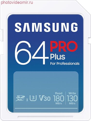 Карта памяти Samsung EVO Plus имеет защищенное исполнение. Она устойчива к воде, перепадам температуры, рентгеновскому и магнитному излучению, падениям. Он позволяет устанавливать карту Samsung EVO Plus в камеры, компьютеры и другую технику. Характеристики: Тип карты памяти - SDXC Совместимость - SDXC Объем карты памяти - 64 Гб Класс скорости - Class 10 UHS-I U3 V30 Скорость чтения до - 180 Мб/с Скорость записи до – 130 Мб/с Характеристики Карта памяти Samsung PRO Plus SDXC 64 ГБ [MB-SD64S/WW]
