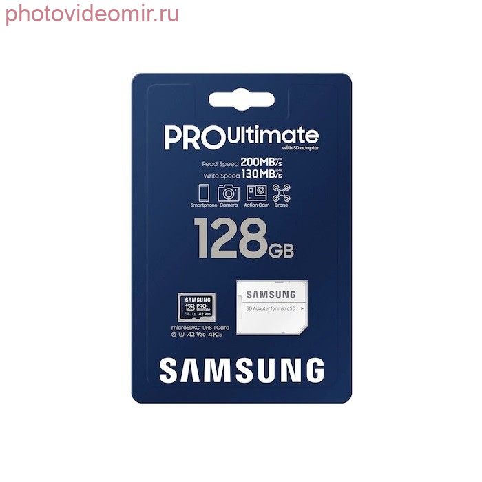 Карта памяти Samsung PRO Utimate microSDXC 128 ГБ [MB-MY128SA/WW] класса A2/UHS Class 3/Video Class 30 записывает/читает данные со скоростью 130/200 Мбит/с. Устройство может выдержать эксплуатацию при температуре от – 25° до + 85° C. Напряжение питания карты составляет 3.6 Вт. Характеристики: Тип карты памяти- microSDXC Совместимость - SDXC Объем карты памяти - 128 Гб Класс скорости - Class 10 UHS-I U3 V30 Скорость чтения до - 200 Мб/с Скорость записи до - 130 Мб/с Характеристики Карта памяти Samsung MB-MY128SA/WW 128 GB с адаптером