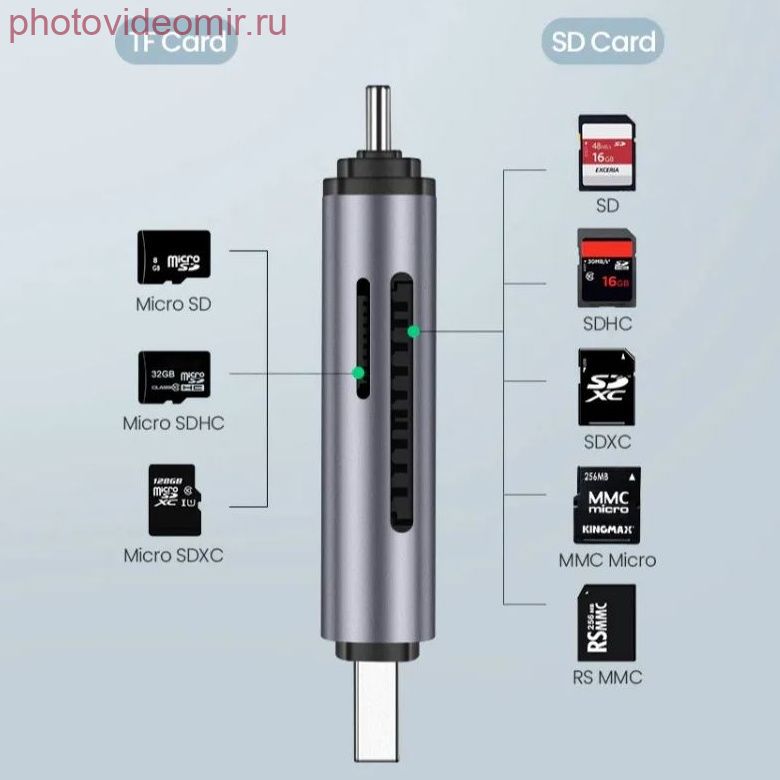 Больше возможностей подключения. Оснащенный разъемами USB 3.0 Type A и Type-C, кардридер можно использовать для обмена данными между картами памяти и ПК, ноутбуками, мобильными телефонами и планшетами с поддержкой USB-A / USB-C / thunderbolt 3 с OTG. Благодаря встроенным микросхемам USB 3.0 устройство чтения карт USB обеспечивает высокую скорость передачи данных до 5 Гбит / с и позволяет передавать фильмы в формате HD размером 1 ГБ всего за секунды.
