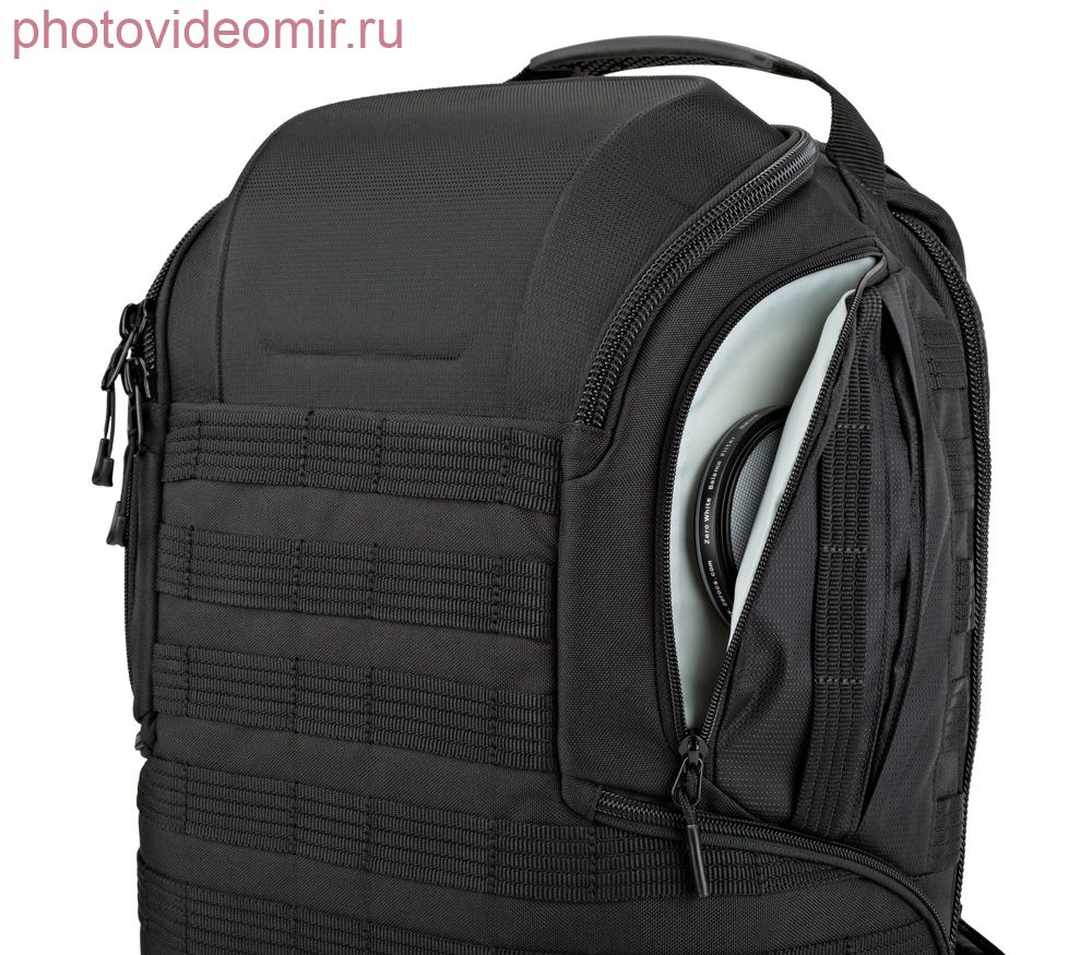 Чуть больше стали боковые люки, теперь в них легче проходят крупные камеры с батарейными ручками. По бокам добавлена полоса с вертикальной ленточной прошивкой. Увеличена пряжка поясного ремня: теперь используется 38-миллиметровая. Внутренние карманы теперь выполнены из полупрозрачной ткани, чтобы вам проще было понять, что где находится. Добавлена широкая петля на спинке, чтобы рюкзак можно было зафиксировать на ручке дорожного чемодана. ProTactic BP 350 AW II вмещает 1-2 камеры и несколько объективов. В зависимости от ваших потребностей, вы можете отгородить часть пространства под личные вещи. Рюкзак предоставляет доступ с 4 сторон: справа, слева, сверху и через спинку. Боковые доступы для безопасности можно закрыть на небольшие навесные замки (универсальные, приобретаются отдельно). Помимо внутренних отсеков в комплекте идут 2 навесных кармана для аксессуаров, два ремня и тканевая чашка для ног штатива. Серия рюкзаков ProTactic интересна тем, что вы можете использовать их в максимально обтекаемом виде (удобно, если вам предстоит перемещаться в тесных, многолюдных пространствах), либо, наоборот, обвесить их по максимуму различными чехлами и подсумками (если вы собрались на пару дней на природу). Как уже говорилось, это очень крепкие рюкзаки, которые способны вынести серьезные испытания. При этом они комфортны и удобны для использования в мирной жизни. Рюкзаки ProTactic BP II выпускаются в 2 размерах: 350 лучше подходит для камер среднего размера и небольших ноутбуков (до 13"), 450 – для больших зеркальных камер с батарейной ручкой и стандартных 15" ноутбуков. Особенности: