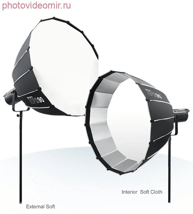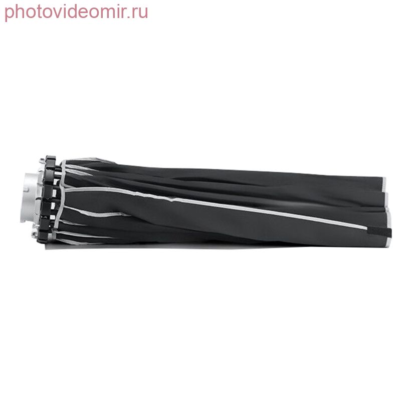 Внутренняя поверхность тента софтбокса серебристого цвета обеспечивает многократное переотражение, в т.ч. за счет параболической формы, дающее резкий контрастный свет и четкие светотеневые границы. В комплект также входят два тканевых рассеивателя (диффузора) – внутренний и внешний. Диффузоры могут использоваться совместно или по отдельности достижения необходимых уровней мягкости и рассеянности света. Рассеиватели крепятся к тенту при помощи липучек, надеть или снять диффузор можно прямо во время съемки. Прочная металлическая конструкция каркаса предназначена для многократной сборки и разборки – быстрой подготовки оборудования к съемке и такого же скорого сворачивания. Чтобы привести софтбокс в рабочее состояние достаточно слегка приподнять спицы над установочным кольцом. Для ускорения процесса сборки, можно поднимать по две спицы, расположенные на противоположных сторонах кольца, одновременно. После проведения съемки, необходимо приподнять спицу и нажать на кнопку, после чего софтбокс сложится. Установочное кольцо спроектировано так, чтобы внутреннее кольцо-адаптер байонета Bowens заменялось на кольца с другим типом крепления (например, Elichrom, кольцо приобретается дополнительно) в случае необходимости. Кольцо сделано максимально компактным, чтобы облегчить переноску и хранение оборудования. Все детали каркаса изготовлены из метала: спицы и механизм складывания — стальные, установочное кольцо и кольцо-адаптер — из легкого алюминиевого сплава. Возможно дополнительное приобретение тканевых сот для большей направленности светового пучка и обеспечения чуть более контрастного освещения. Характеристики: