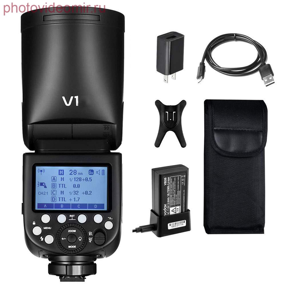Комплектация: - Накамерная вспышка Godox V1 - Литий-ионная батарея VB26 - Зарядное устройство - USB зарядное устройство - USB кабель - Мини-стойка - Чехол - Руководство по эксплуатации Характеристики Вспышка накамерная Godox Ving V1S TTL с круглой головкой для Sony